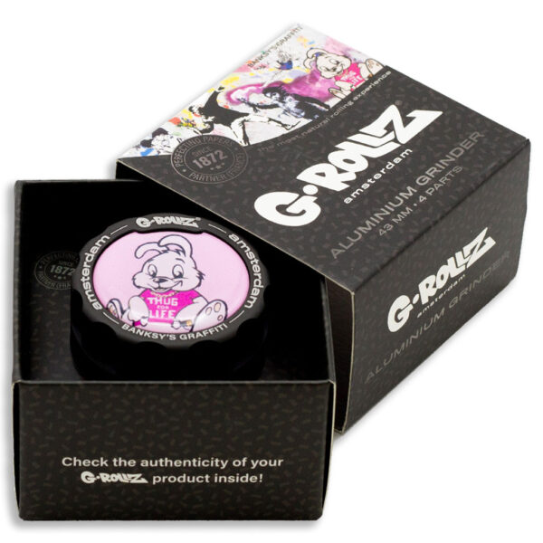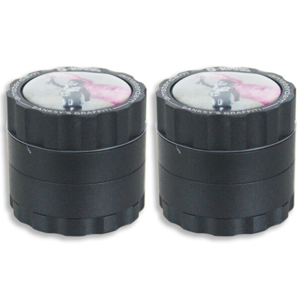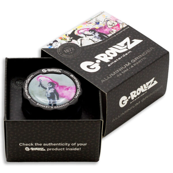 Metalen grinder van G-Rollz. Speciale uitgave Banksy. Per stuk verpakt. Display van 6 stuks.