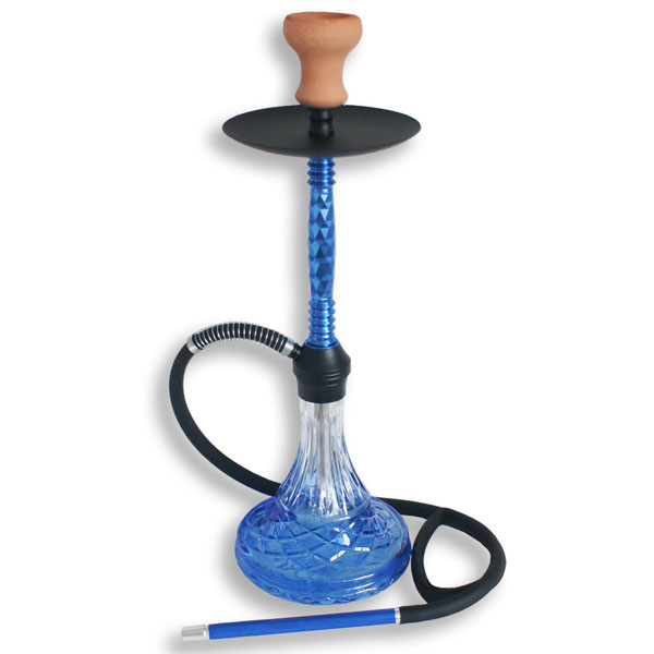 Waterpijp uit de Aladin Alux Serie. Aluminium waterpijp met silconenslang en bewerkt glas, compleet met mockingbird.
